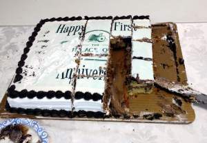 Owners Vanetta and Monique have a lot to celebrate, having weathered more than their share of first-year difficulties. Given what they’ve been through, it was perfectly ironic that the cake experienced its own mini-disaster on the way to the party.