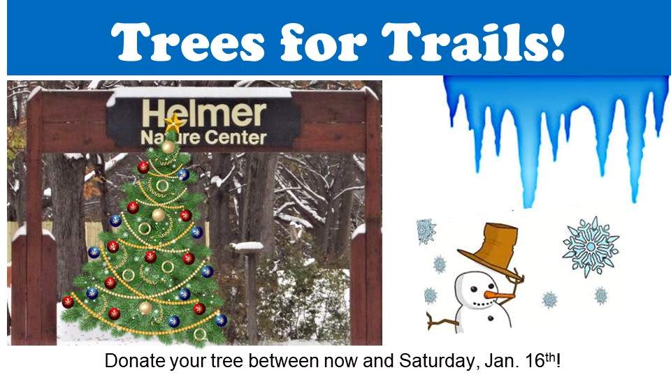 Rather than put your Christmas tree to the curb after Dec. 25, bring it to Helmer Nature Center, where it will be used to create wood chips that mitigate trail erosion. Starting Dec. 26, bring your tree to the Helmer parking lot for recycling. We will collect trees until the Jan. 16th Trees for Trails event when volunteers will help unload your tree and High Falls Tree Service and Irondequoit Lawn & Landscape will be on-site recycling trees. This will happen from 10 a.m. to 1 p.m.