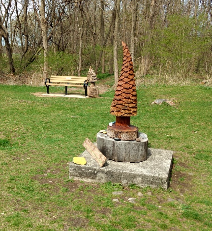 My husband and I came across the little tree back in 2016 while we were riding the canal. It stood in a small clearing about a quarter mile southeast of Great Embankment Park. It was clearly a piece of chainsaw artwork, but the only identyfying feature was a date: 9-6-98.