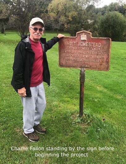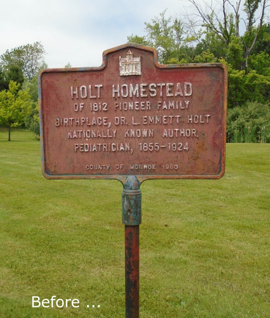 During the weeks of summer, every time I passed the Dr. Holt house on Holt Rd., I thought about repainting the faded words and colors of the historical marker located on the property. It is an important piece of the medical history and of Webster. Dr Holt was an important player in the discovery of milk-related illnesses and other diseases in children.