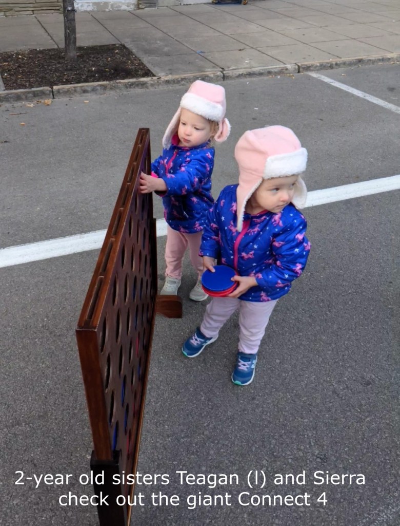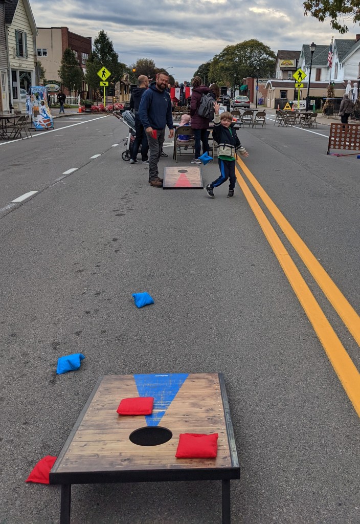 It wasn’t 65 degrees and sunny like the first Family Games Night back in July. And certainly not in the high 70s like the second one in September. But chilly autumn breezes and overcast skies didn’t deter hundreds of adults and children who braved the cold last Saturday evening to enjoy German music, German food and giant games set up on West Main Street.
