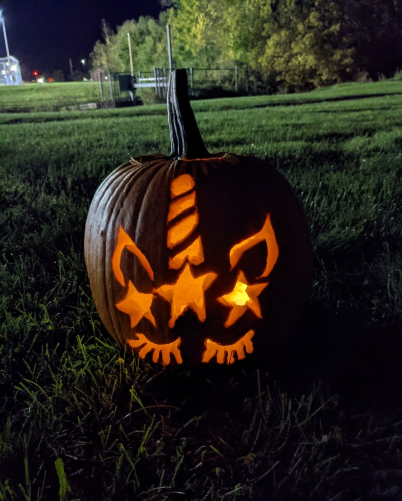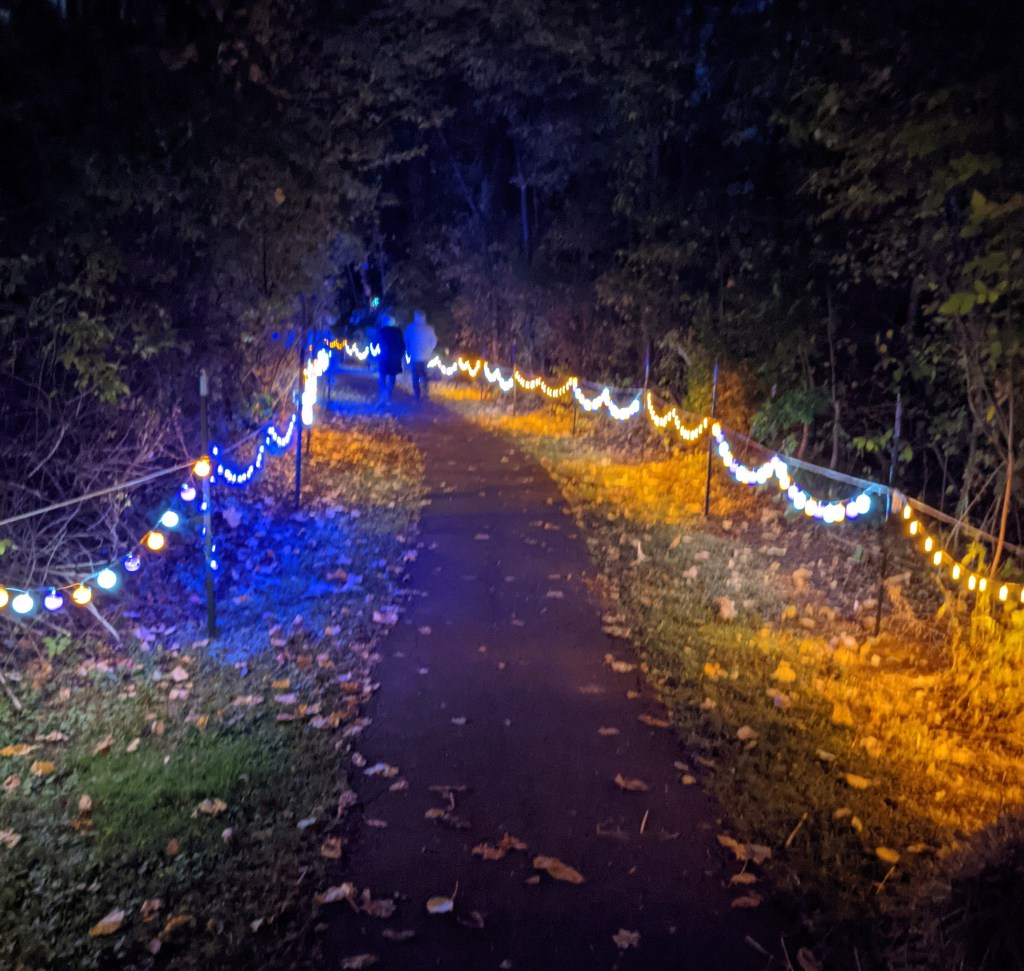 For more than an hour and a half after dark, thousands of people strolled along the mile-long Chiyoda Trail winding behind the Rec Center, which was lined with hundreds of extremely creative, illuminated jack-o-lanterns. The designs ran the gamut from traditional and whimsical to spooky and just plain weird. I saw Olaf and Ernie, the Lego man, spiders, ghosts, unicorns, and lots of toothy grins. For added enjoyment, two of the homeowners whose houses back up to the Rec Center property were playing spooky music for the families that strolled by.
