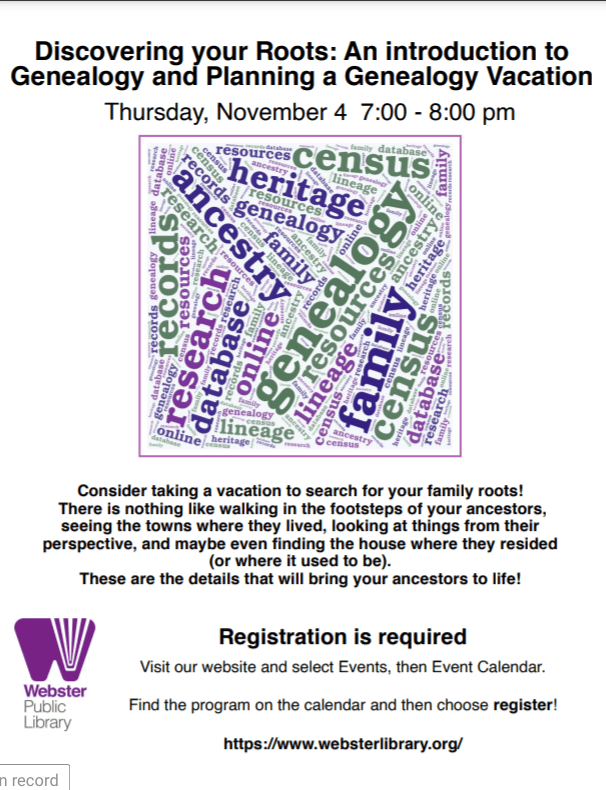 Thursday Nov. 4, 7 to 8 p.m. — Discovering Your Roots: an introduction to genealogy and planning a geneaology vacation.