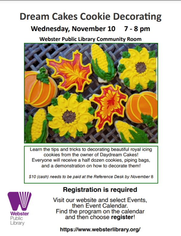Wednesday Nov. 10, 7 to 8 p.m. — Dream Cakes Cookie Decorating: learn some decorating tips and tricks and amaze your friends and family