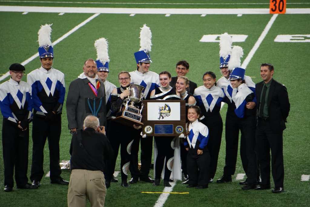 After the performance, the band’s seniors and drum major assembled on the field with the other bands to hear the scores and receive their award. They were welcomed home on Halloween evening with a Webster police and fire department escort to celebrate their championship.