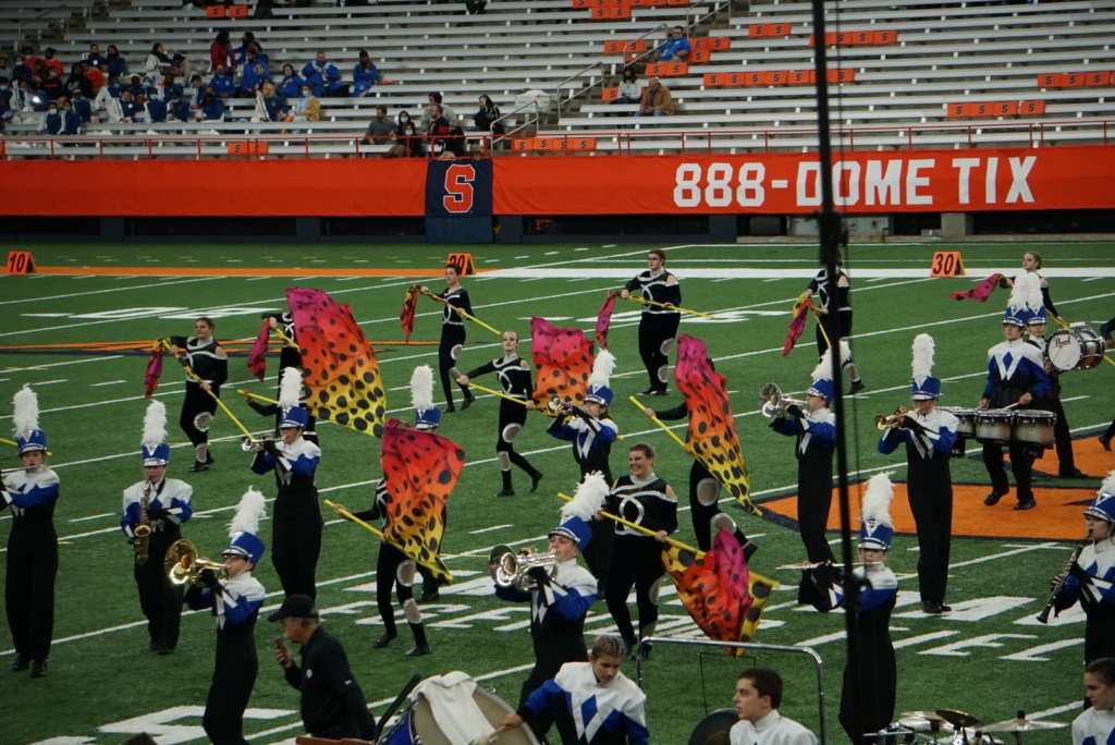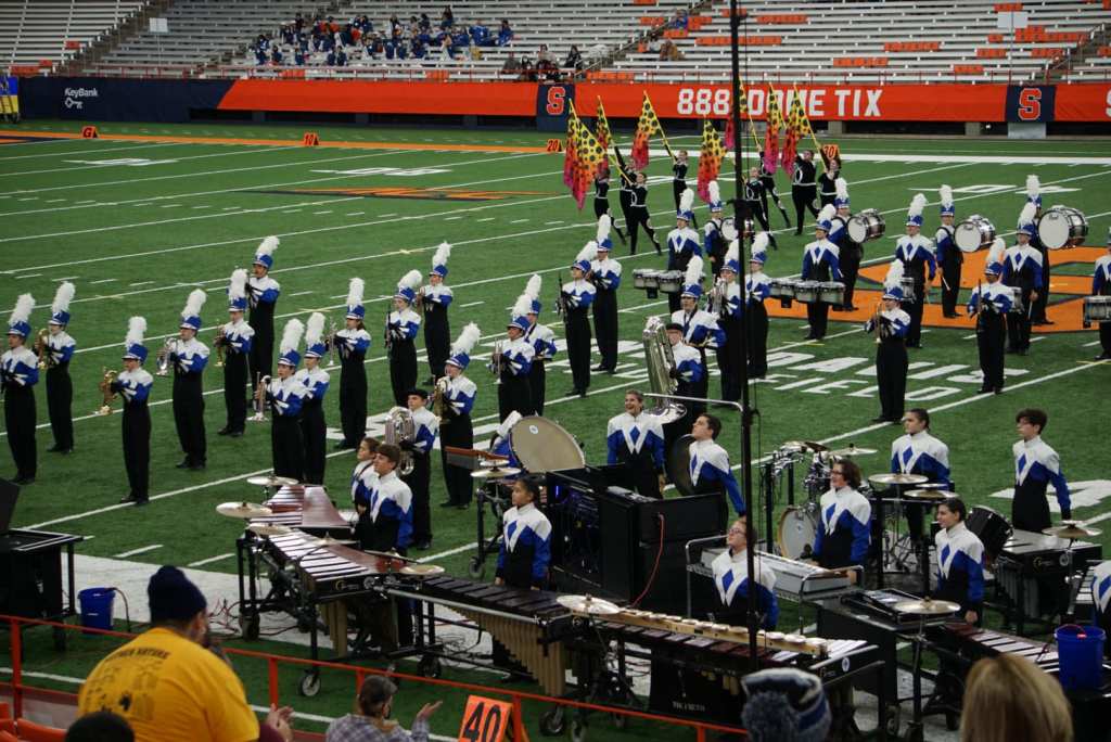“Championship day is a FULL day,” wrote Band Director Jerbrel Owens. “We start early in the morning with a hearty breakfast and we then take the long drive to Syracuse. We are on a tight schedule so the students need to move quickly, warm-up, and move again until it’s our time to enter the Carrier Dome.”