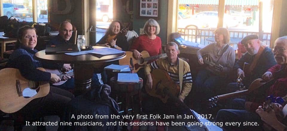 The group was successful from the very beginning, drawing musicians from all over the area, including several Golden Link board members. The first session, held on January 7, 2017, attracted nine musicians, most of whom still attend regularly. Since then, the circle might have as few as four or five, whereas other weeks as many as a dozen musicians and their instruments have had to squeeze into the bakery corner.