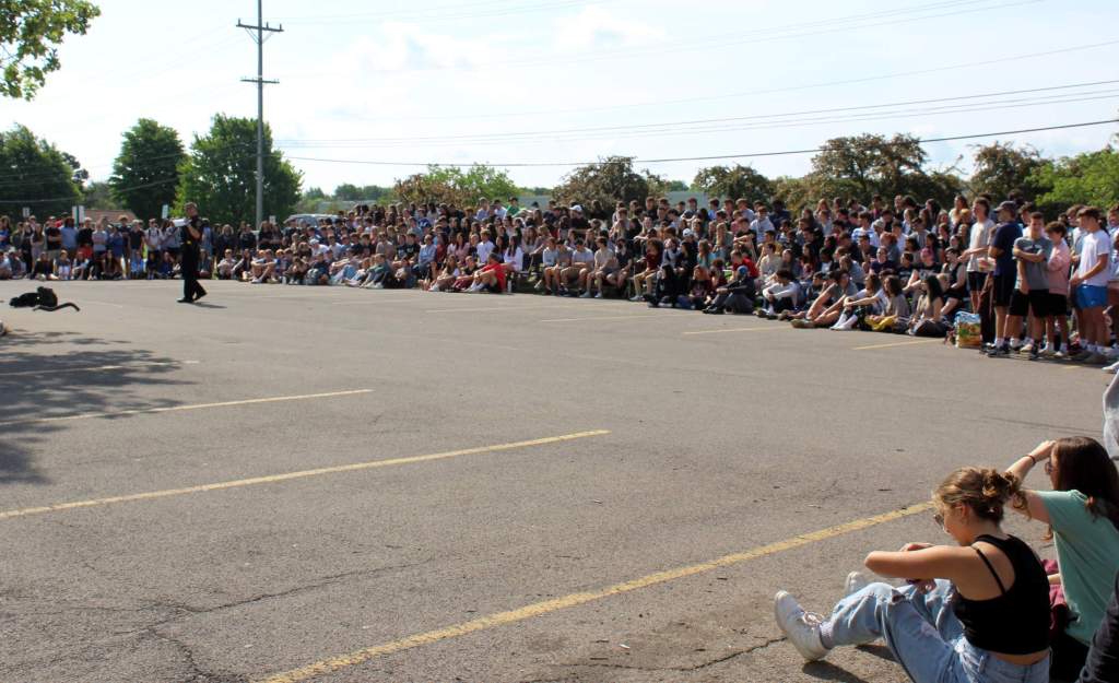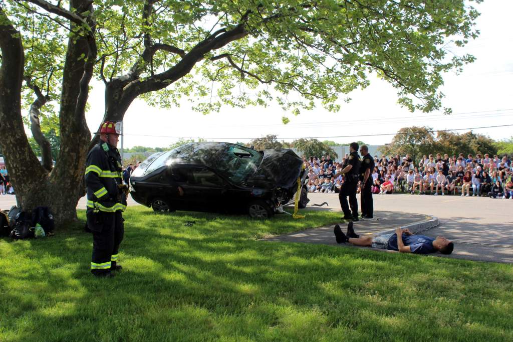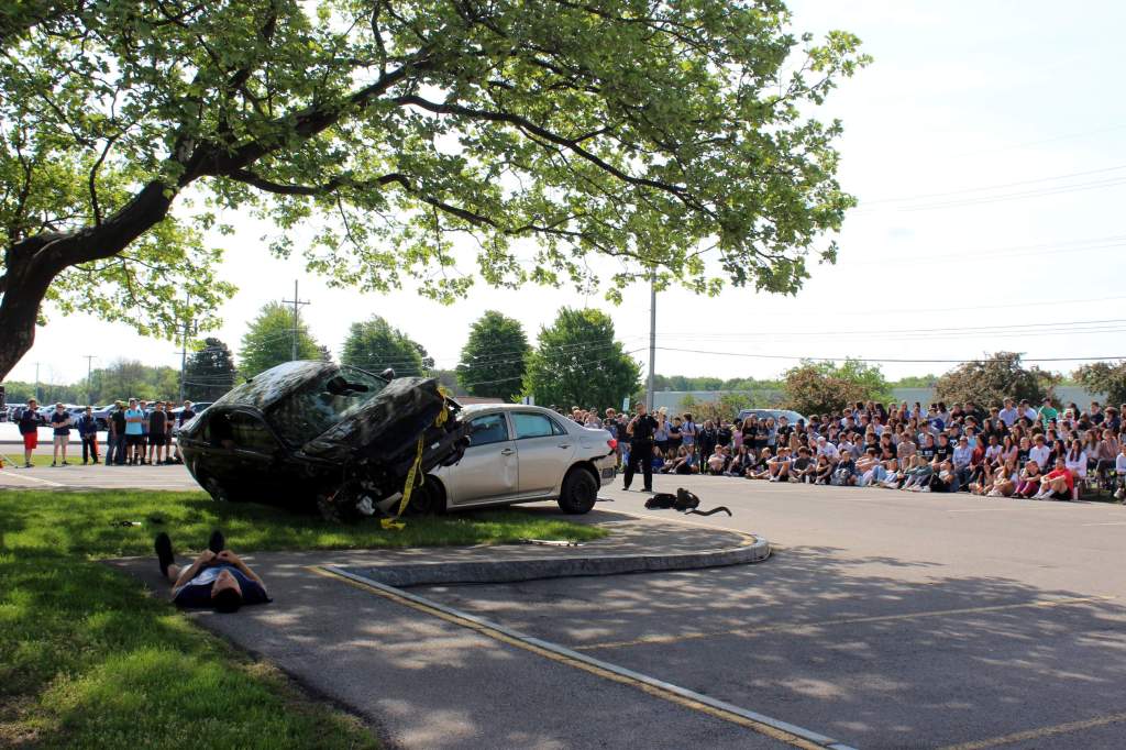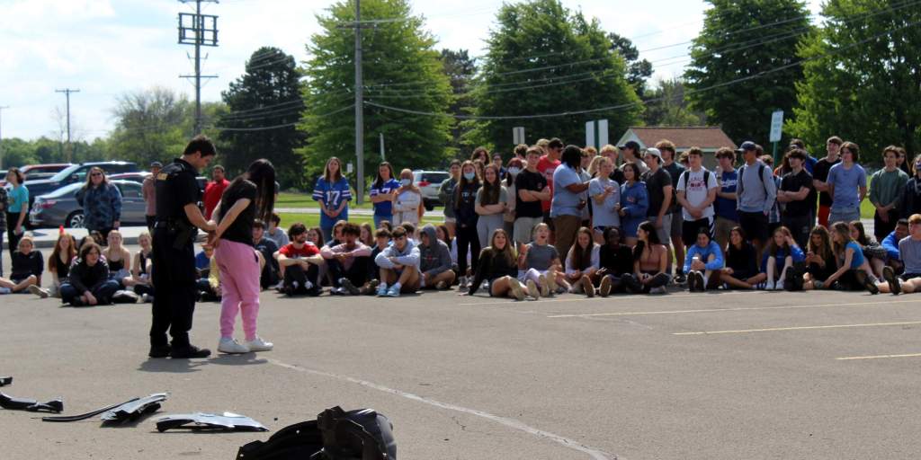 The scene imagined a two-car accident occurring just down the street from the high school, at the corner of Five Mile Line Rd. and Publisher’s Parkway. About 700 juniors and seniors watched from bleachers in the parking lot as School Resource Officer David Herrle described what happened.
