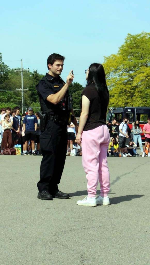 This young lady played the part of the drunk driver. Here she is given a field sobriety test.