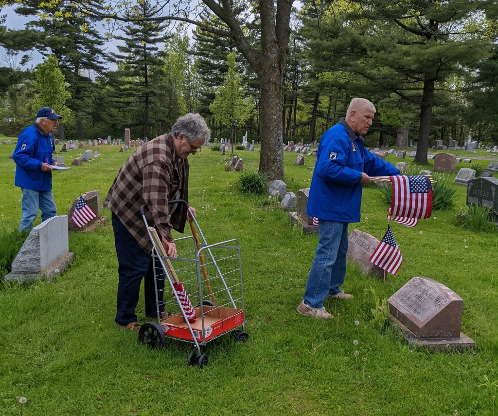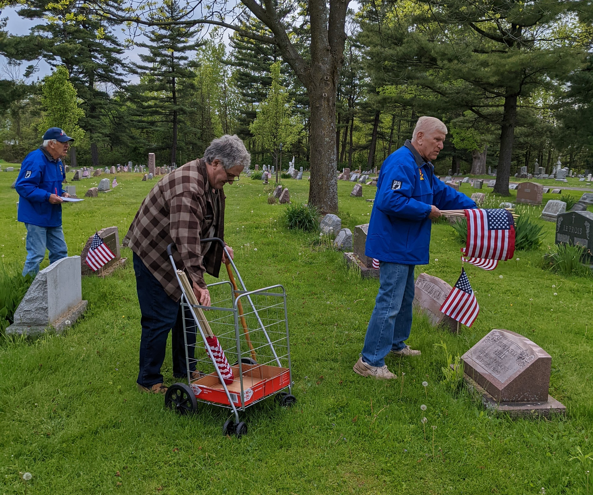 By the end of this week, flags should be in place at Union Hill, Holy Trinity, West Webster and Webster Union cemeteries. Next Wednesday, the teams will head to Webster Rural Cemetery. If you notice that a veteran has been missed, call Charlie Klauck at 585-671-2302.
