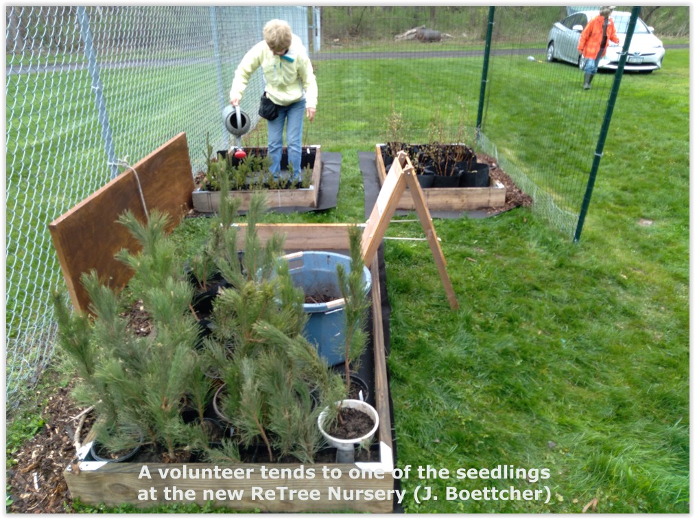 Plans are continuing apace. The Friends recently completed their new ReTree Nursery, located adjacent to the Webster Parks and Recreation maintenance building on Webster Rd. A few weeks ago, volunteers planted 100 Sweet Gum, Red Pine, White Spruce and Nine Bark seedlings in the nursery, many purchased from New York State and Monroe County, and others raised from locally collected native plants.