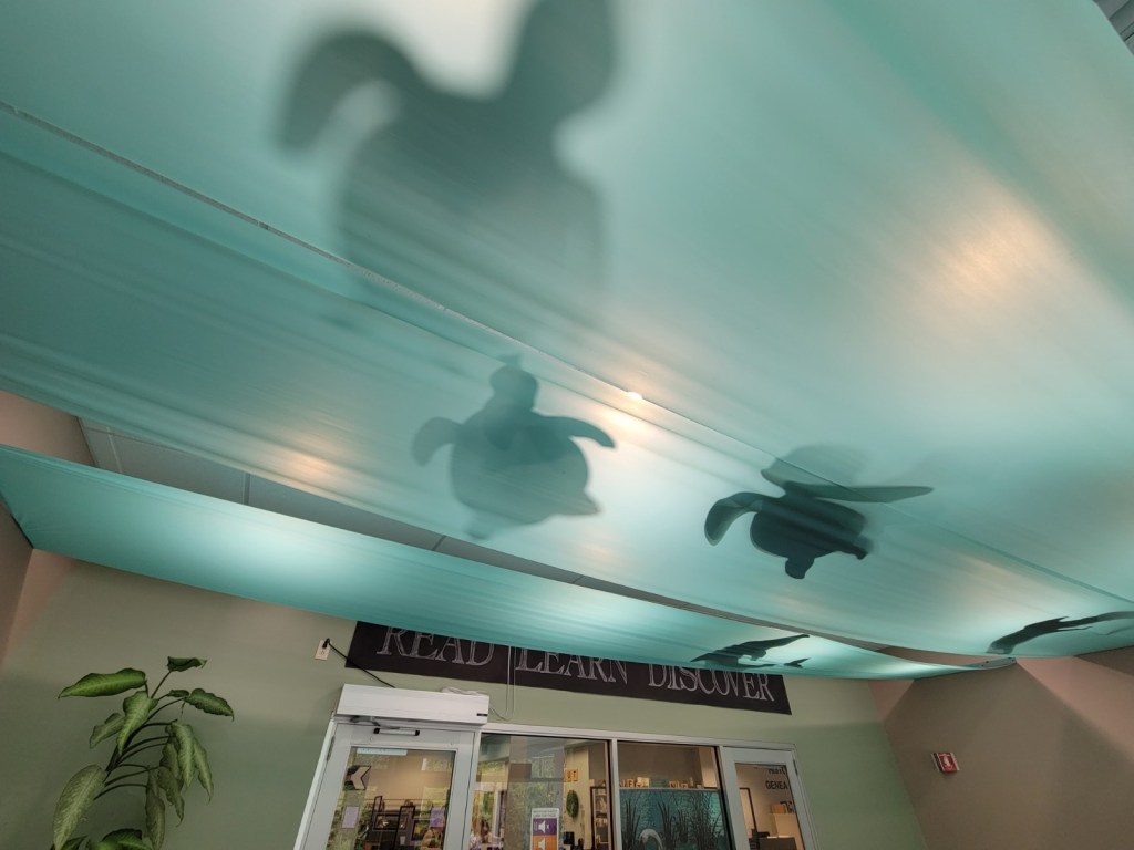 If you’re a fan of our Webster Public Library (and you should be), you probably have noticed that there’s much more to the library than just books and DVDs and periodicals and puzzles. In many respects it’s like a mini art gallery. And I’m not just talking about the local artist’s wall over by the Community Room, which regularly displays fine art and photographs from local residents. No, I’m talking about the other creative artwork hanging throughout the space (like the sea creatures in the children’s area) or growing out the floor (like the big Reading Tree in the main lobby).