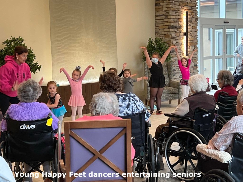 Denise calls the program “Happy Feet.” It originated several years ago when Denise’s mother, “Miss Tina,” was living at Atria assisted living facility in Penfield. Denise wanted to give the residents a fun and entertaining intergenerational activity, so one evening she invited some of her students to meet at the facility for a “date night” with the residents. The evening was a great success, and the Happy Feet Dance Crew was born.