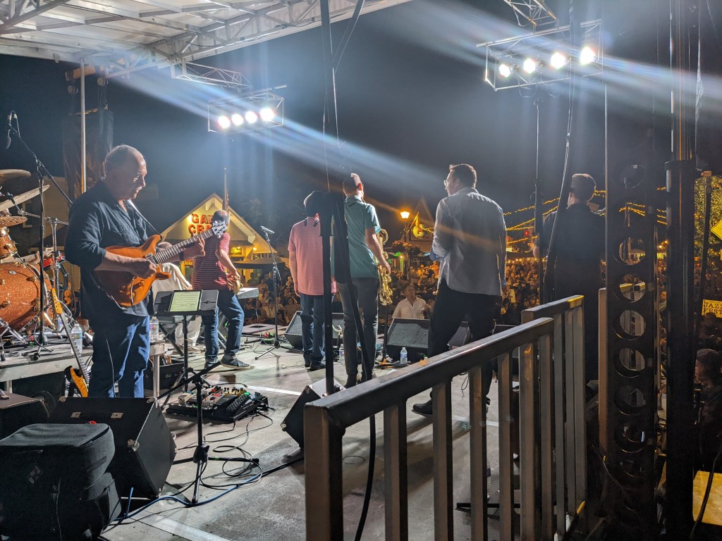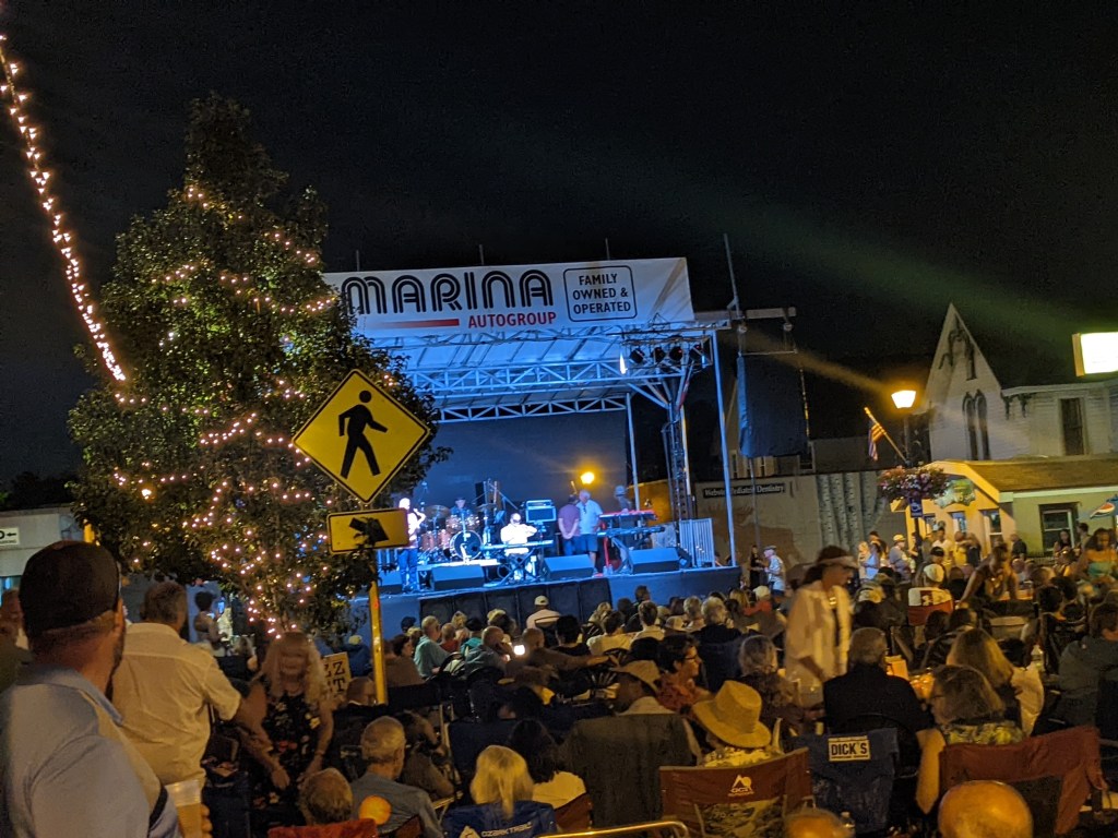 In the many years I’ve attended the Jazz Fest, I can’t recall ever seeing so many people. When I got into town at about 6:45, the street, sidewalks, even alleyways and driveways were already packed with tables and chairs and coolers. I didn’t think it could get any busier. But as the evening went on, people kept coming, and by the time Prime Time Funk hit their first downbeat at 9 p.m., people had filled in pretty much every nook and cranny along West Main.