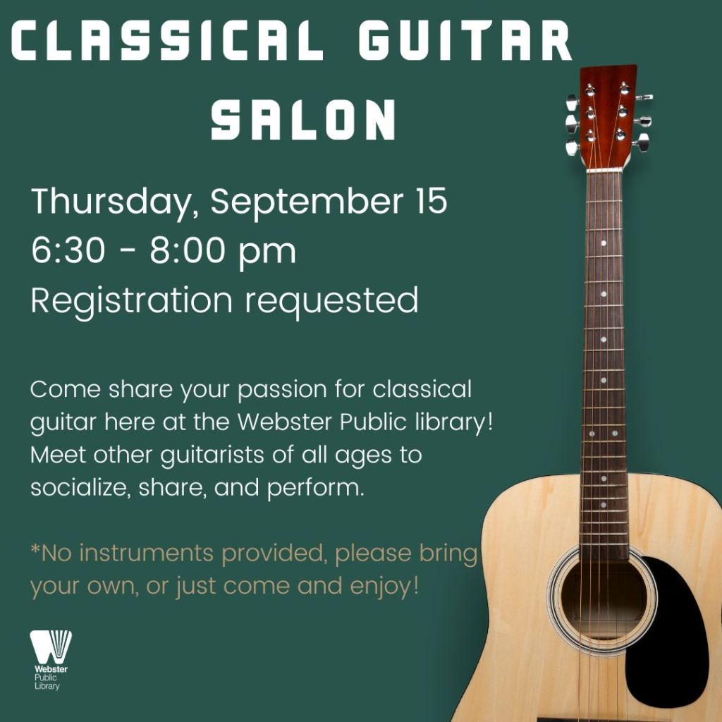 - Thursday Sept. 15, from 6:30 to 8 p.m.: Classical Guitar Salon. Bring your guitar and meet other guitarists of all ages to socialize, share and perform. Registration is requested.