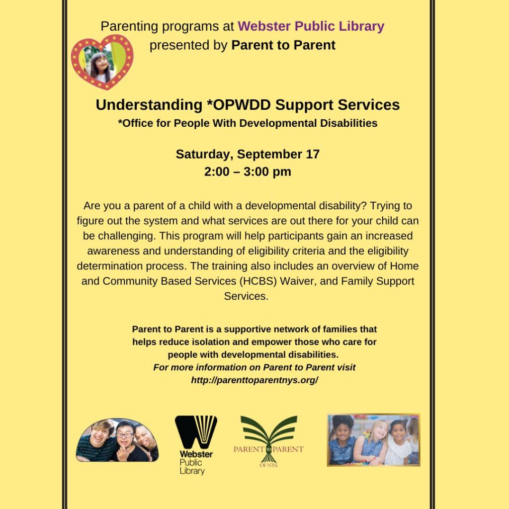 - Saturday, Sept. 17, from 2 to 3 p.m.: a parenting program from Parent to Parent called Understanding OPWDD Support Services (Office for People with Developmental Disabilities). Especially for parents of children with developmental disabilities.