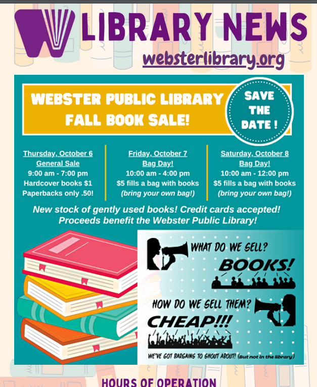 - Thursday Oct. 6 through Saturday Oct. 9, the Webster Public Library Fall Book Sale returns, with an incredible variety of books at more incredible prices. More to come about this, but check out the flyer below for more information.