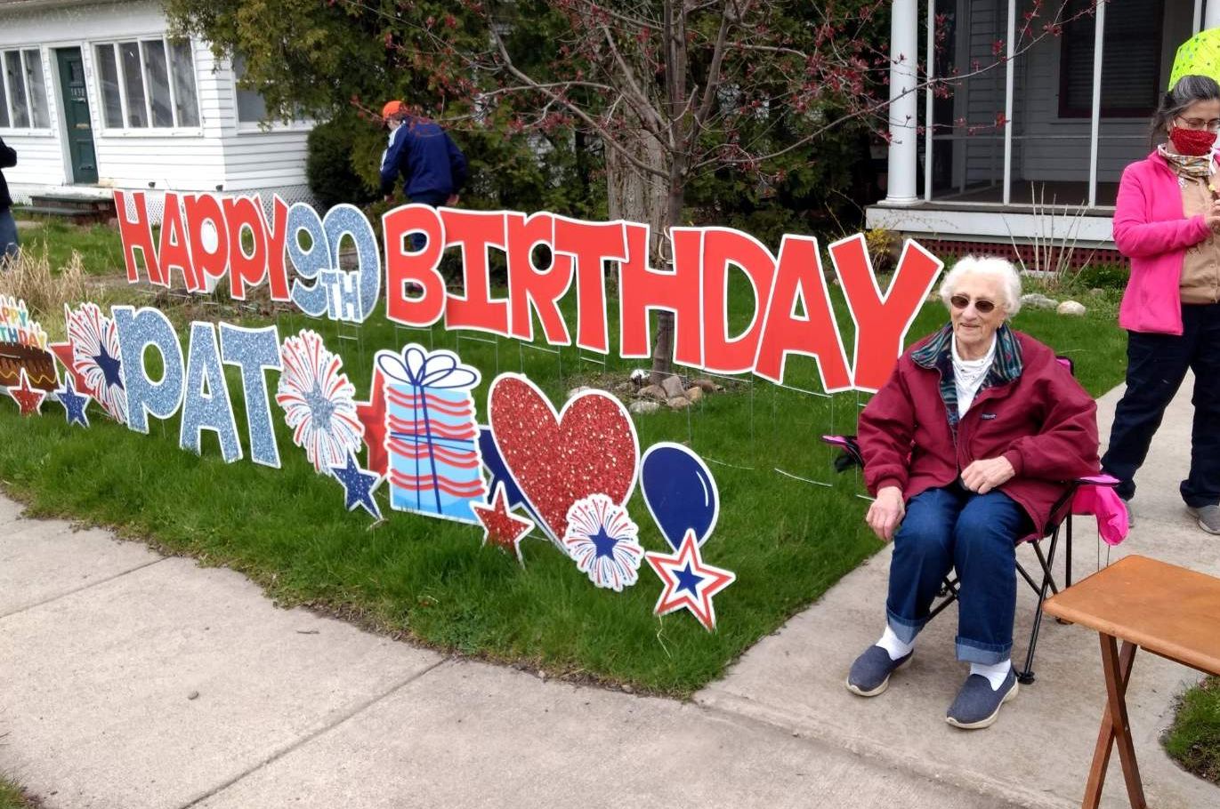 Precisely at noon on April 28, 2020, dozens of cars, truck and jeeps covered in banners and balloons, led by emergency vehicles all sounding their sirens and air horns, streamed past Pat’s East Main St. home as she watched with a huge grin on her face. The parade even included a drum majorette, Webster’s own Denise Baller of Dancing With Denise.