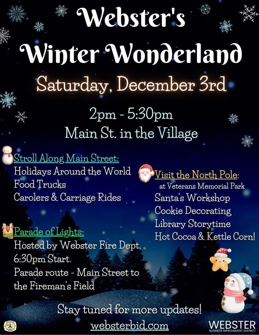 Webster’s Winter Wonderland will take place on Saturday Dec. 3 from 2 to 5:30 p.m. in the Village of Webster. The incredible Parade of Lights, hosted by the Webster Volunteer Fire Dept. (thank you WVFD!) begins at 6:30 p.m.