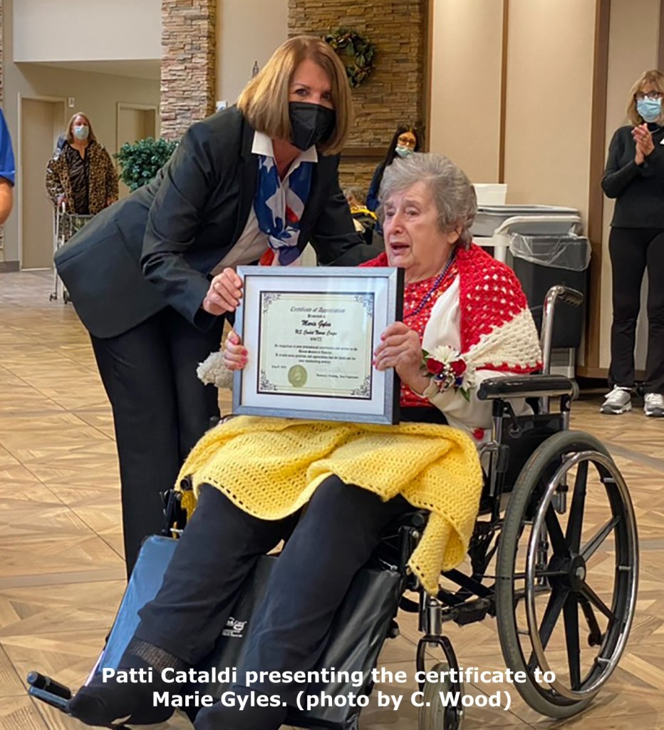 On Friday Nov. 11, Town of Webster Deputy Supervisor Patti Cataldi and Cherie Wood, from the Daughters of the American Revolution, Canandaigua Chapter, attended the Veteran’s Day ceremony held at the Maplewood nursing home. They made the trip especially to present a Certificate of Appreciation to Maplewood resident Marie Gyles.