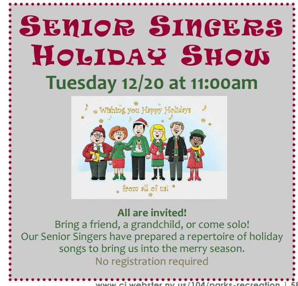 - first is the Senior Singers annual Holiday Show, scheduled for Tuesday Dec. 20 at 11 a.m. This would be a great opportunity to find out more about this group and meet some of the members if you’re at all interested in joining. IN any case, it will feature some beautiful holiday tunes. Admission is free,