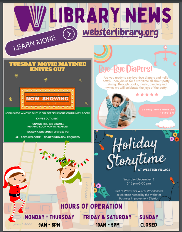 The Webster Public Library has all kinds of fun events scheduled this month, from crafts to storytimes to live music. Check out the flier below for some details, but here’s one I want to highlight: