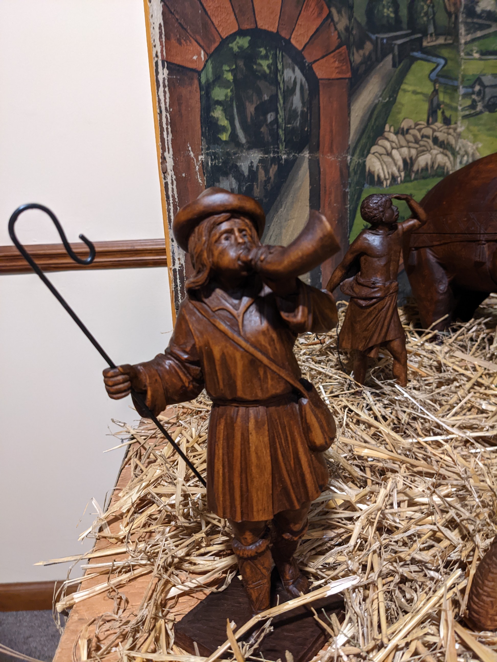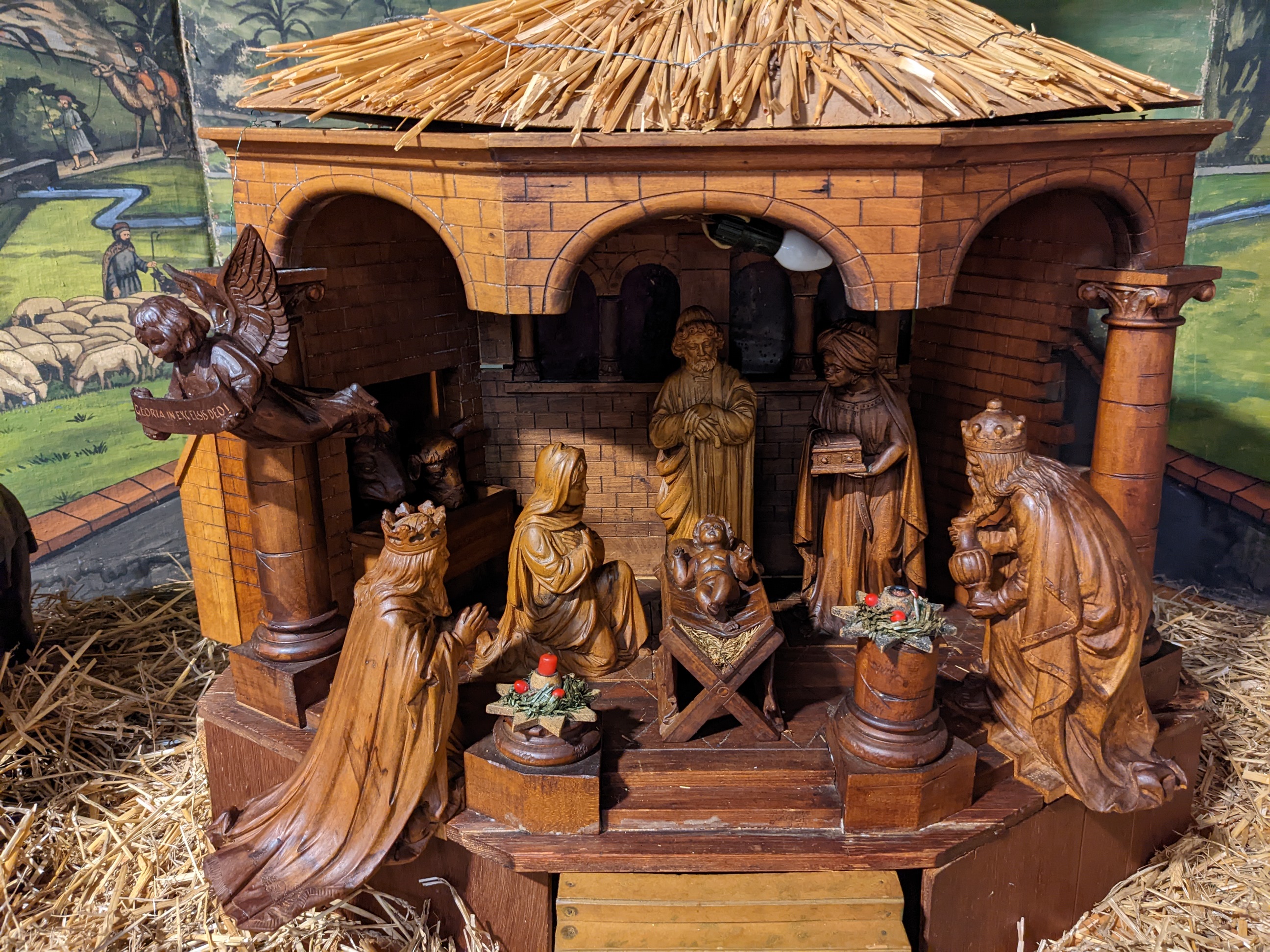 This beautiful, hand-carved creche, on display near the museum’s entrance, has a beautiful history all its own. This creche was made in Germany by C. Jess, a church architect. He made one piece a year between 1918 and 1944, each year giving the newly carved piece to his sister Freda in Frankfurt, Germany.