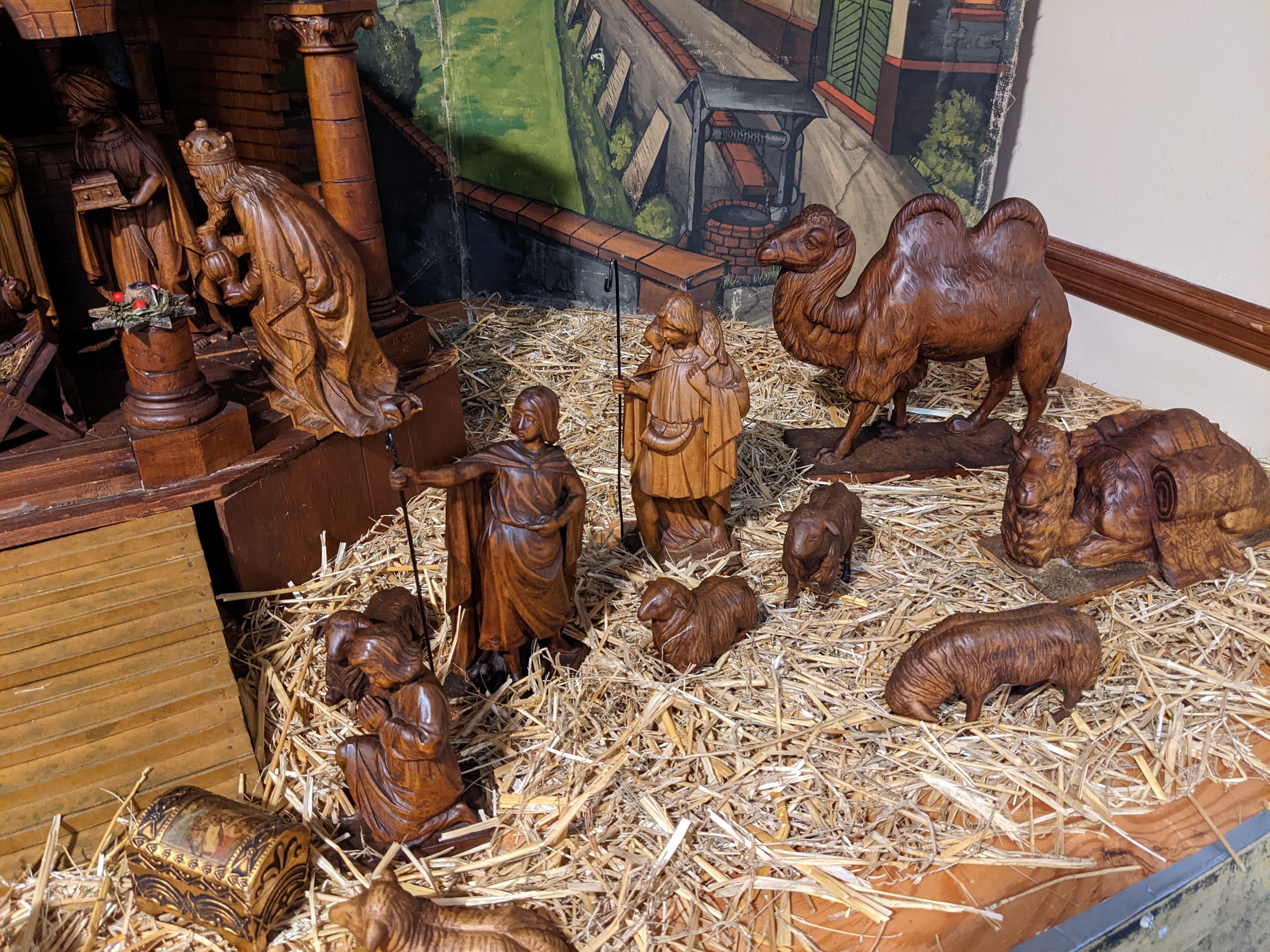 The scene has roughly two dozen pieces, all hand carved out of linden wood. In addition to Baby Jesus, Joseph and Mary and the Three Kings, it also includes a shepherd boy, angels, sheep, camels, oxen, and even an elephant.