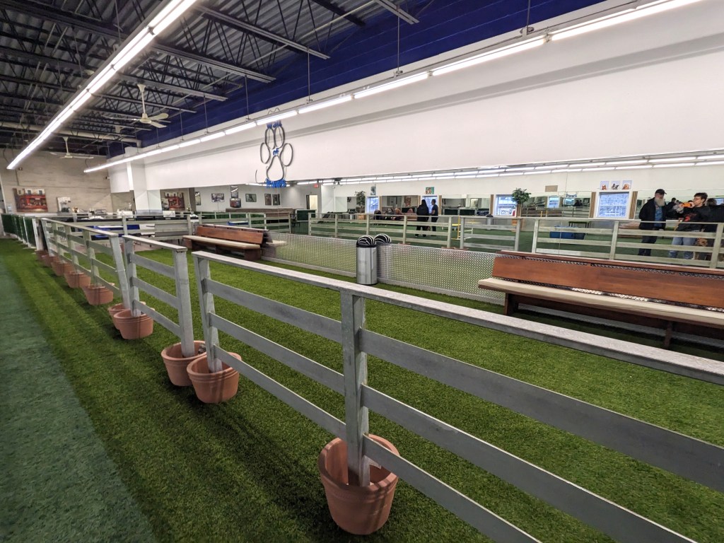 There’s a very large, astro-turfed area for large dogs to run around in, which owner Christine Gigante had sprinkled with some agility equipment. Fenced off to the side is a smaller area for smaller dogs, and both areas have benches along the walls for the pups’ parents to sit while their dogs play.