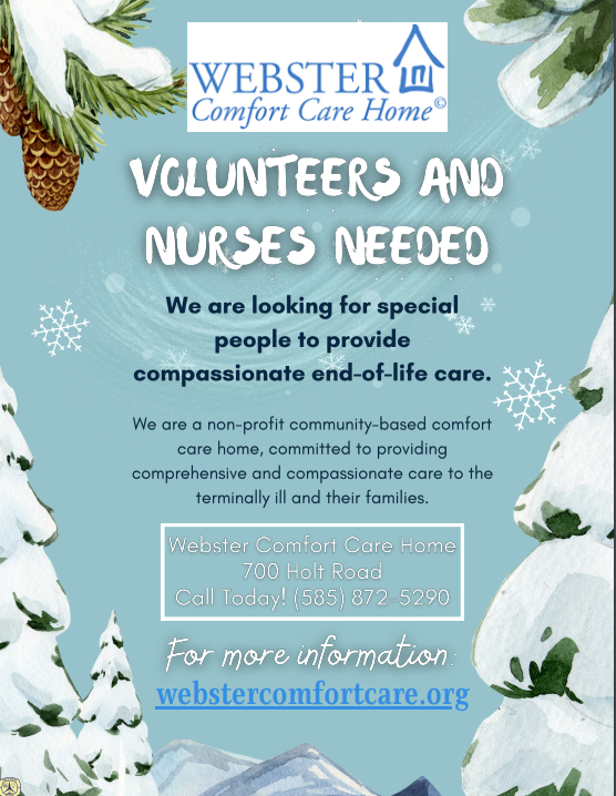 Webster Comfort Care Home, at 700 Holt Rd., is also in need of volunteers and nurses to help them with their mission to provide compassionate end-of-life care for terminally ill patients. For more information, visit webstercomfortcare.org.