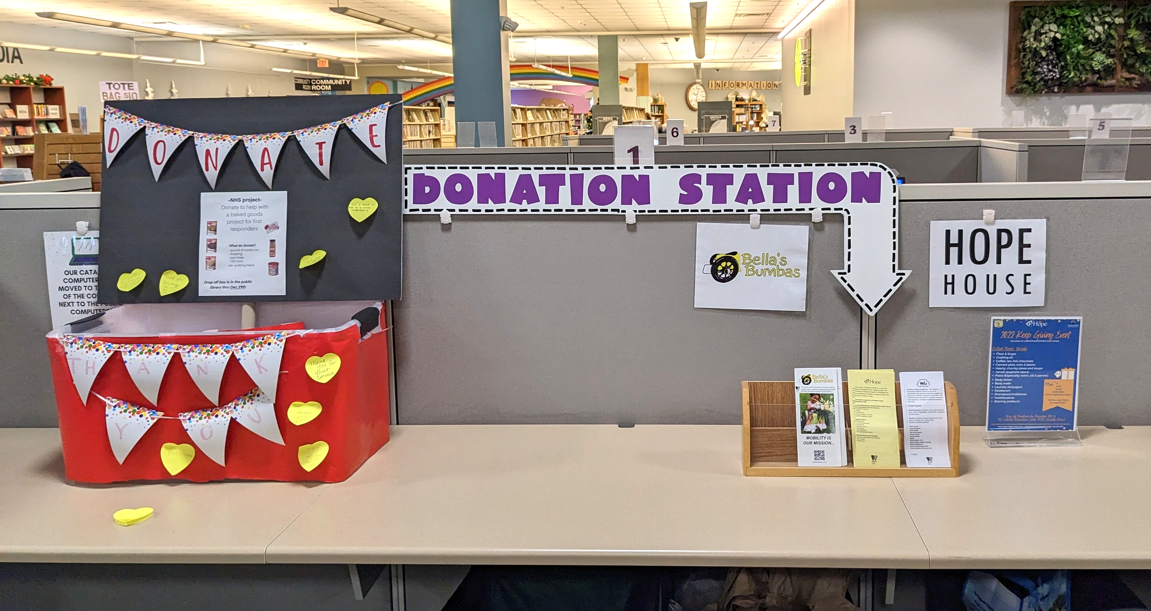 They’ve recently created what they’re calling a “Donation Station” right next to the circulation desk, with information about three local organizations, including a list of what they need, and a box for each where you can deposit your donations.