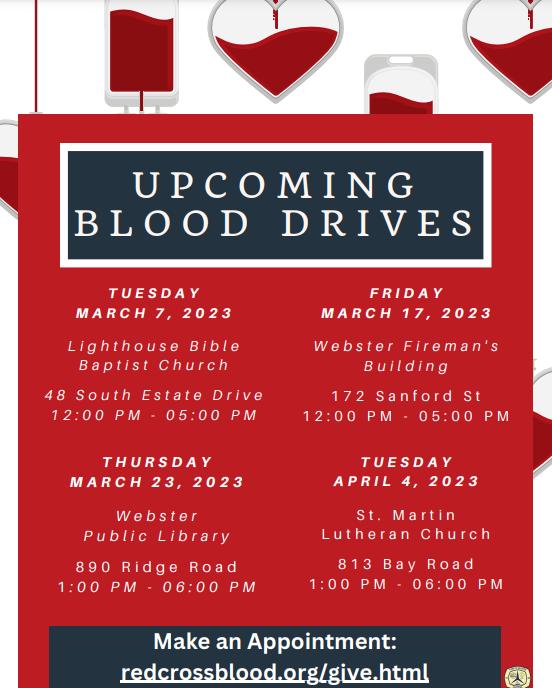 - Thursday March 23, 1 to 6 p.m., Webster Public Library, 980 Ridge Rd.