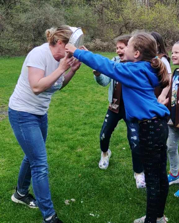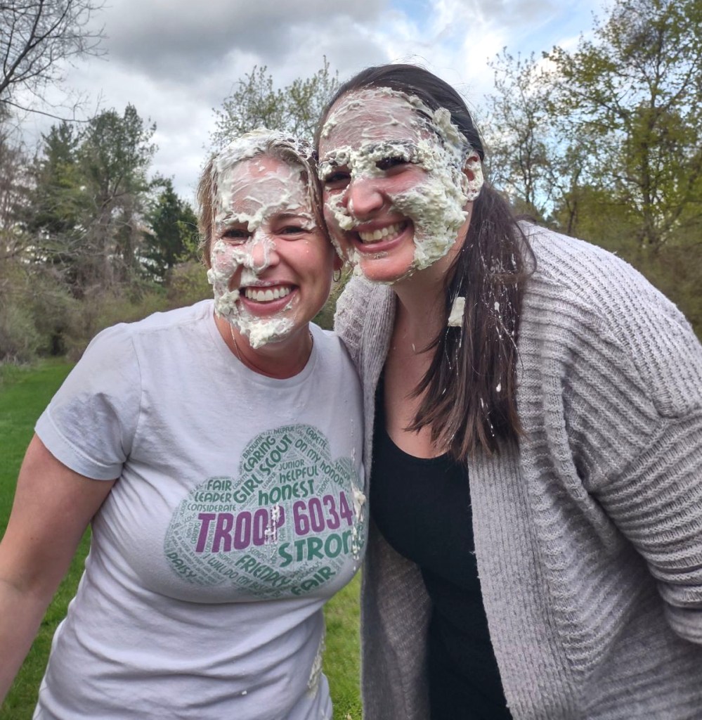 As a special treat for all their hard work, the girls also got to plant a pie in the face of each of their troop leaders, Linda Meyers and Daniela Viavattine.