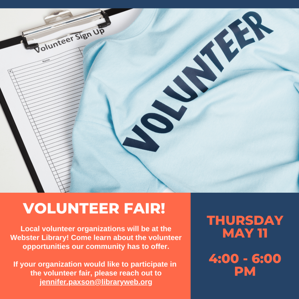 For starters, here’s a reminder about the very popular Volunteer Fair, which returns to the Webster Public Library on May 11 from 4 to 6 p.m. This great event is especially for teens and adults looking for volunteer opportunities across the Webster area.