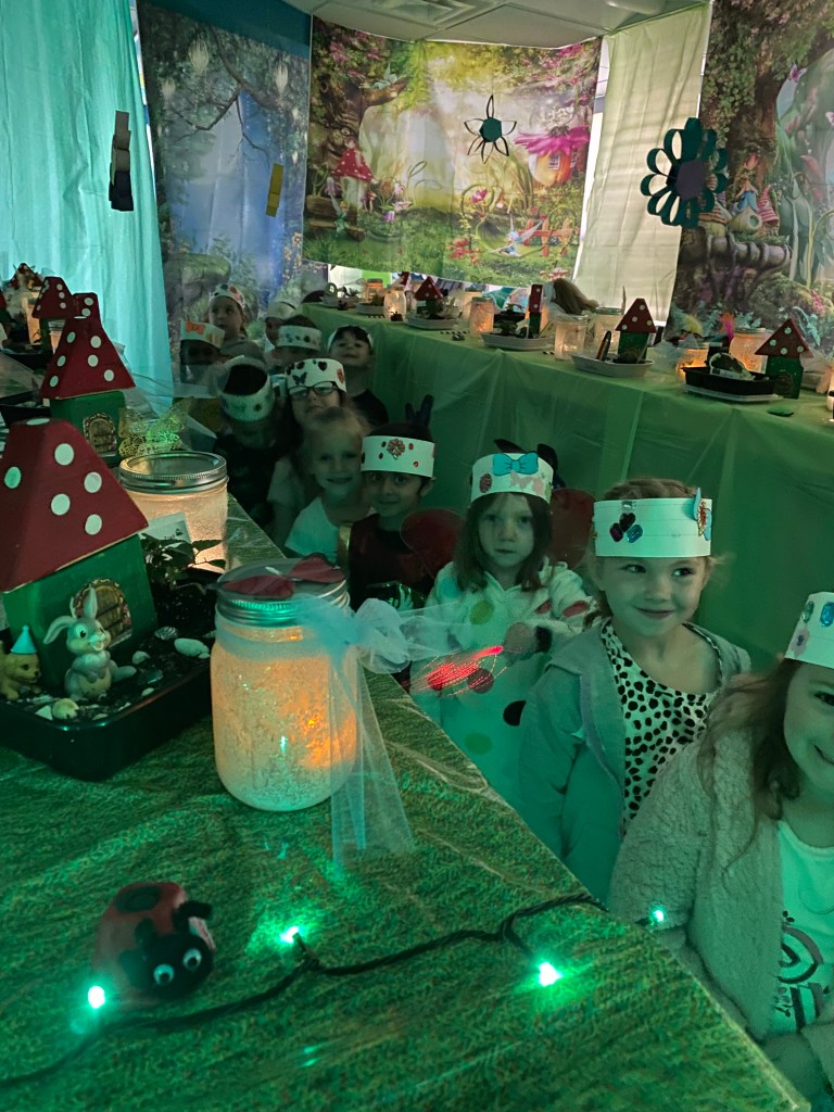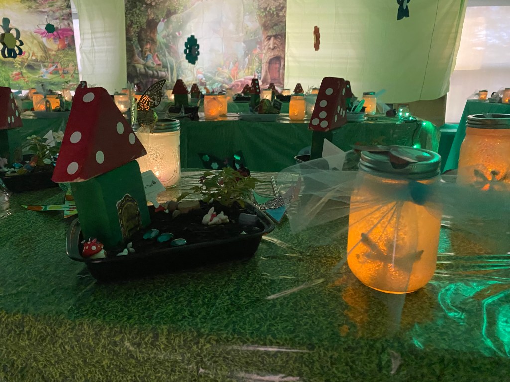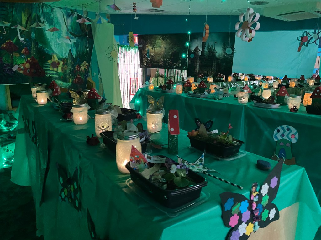 This year, Smith invited the entire school to take part in the magical festivities. The response was heartwarming. Individual grade levels embraced the challenge to make different parts of the fairy trail; fourth graders made flowers to hang from the ceiling. First graders made stepping stones, UPK students made ladybugs and butterflies, OT students made beaded raindrops and umbrellas, and the kindergartners made fairy gardens and fairy jars.