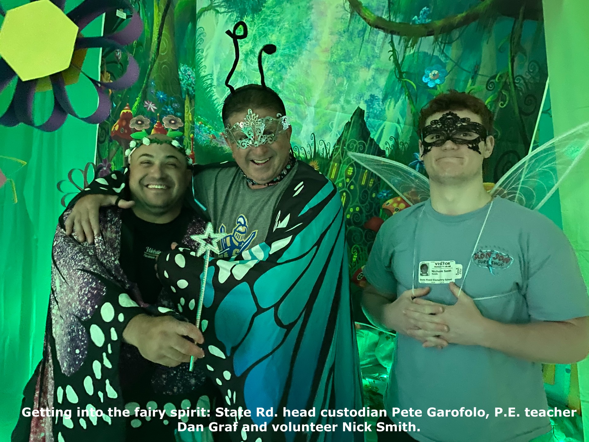 But Smith was particularly touched by the support she received from State Rd. staff members, who showed up in force to help decorate the library on Friday afternoon. They helped drape green tablecloths over the bookshelves, hang backdrops, spread twinkling green lights along the pathway, hang butterflies and flowers, set up all the houses and fairy jars, and so much more.