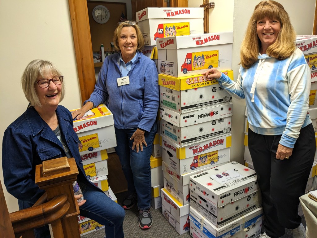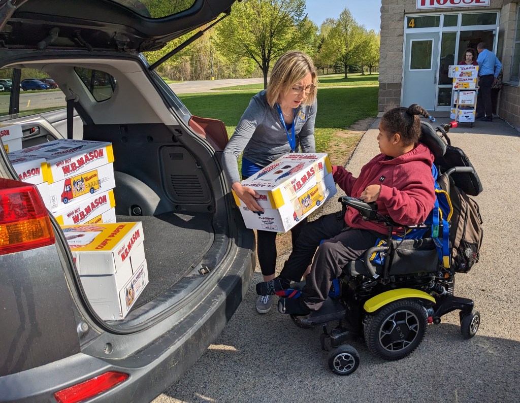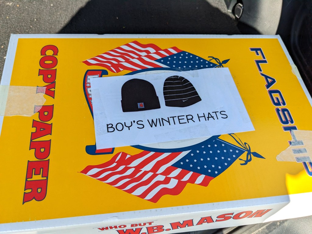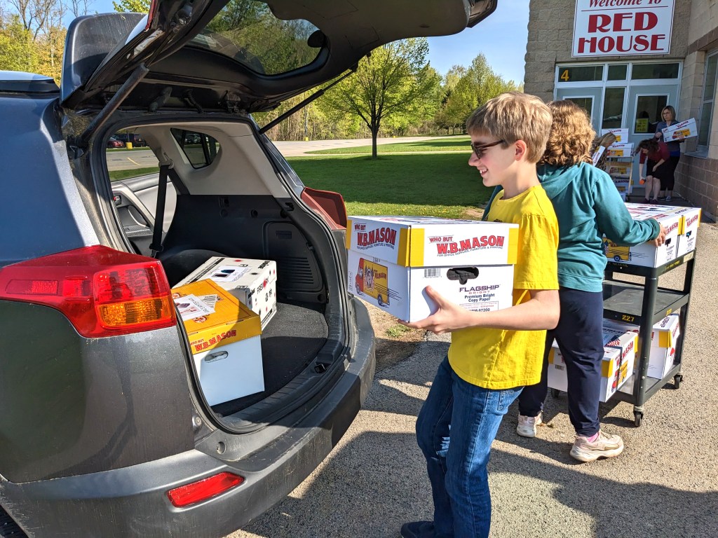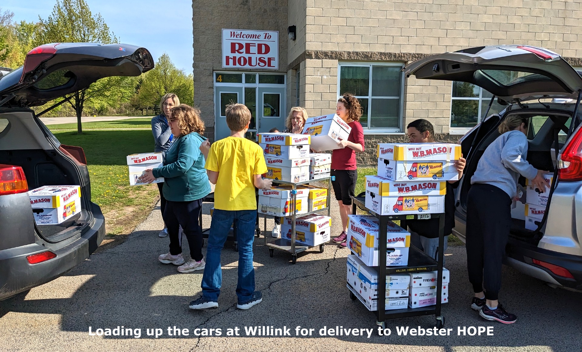 This is the second time this school year that the students have completed the ambitious lost and found project. Last December they packed and delivered 38 boxes to Webster HOPE. This spring they almost doubled that haul, collecting 64 boxes filled with hats, gloves, snow pants, sweatshirts, jackets, water bottles, lunch boxes, and even Halloween costumes. Earlier this week, they packed them all into two SUVs and then Cori delivered them all to Webster HOPE. There, a small army of very grateful volunteers helped unload them to be stored until they can be distributed to the agency’s clients.