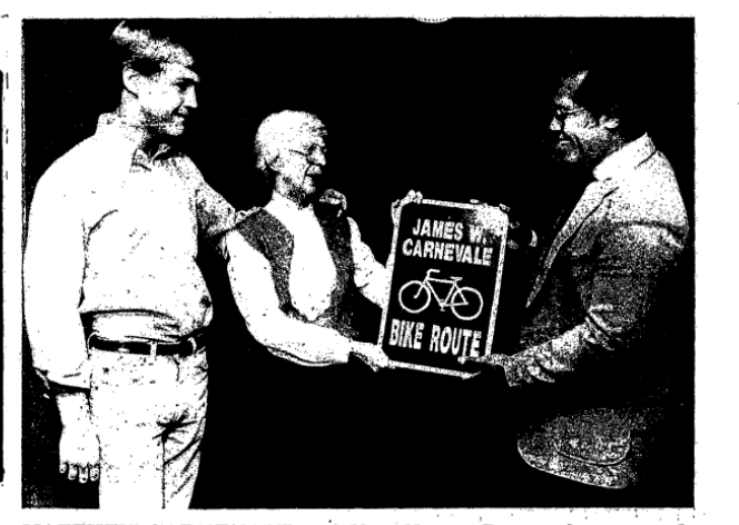In 1986, the route was officially renamed the “James W. Carnevale Bike Route” in honor of his service as Recreation Commissioner. At a ceremony held in November, the Town of Webster presented Carnevale’s widow with one of the signs.