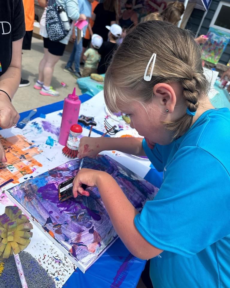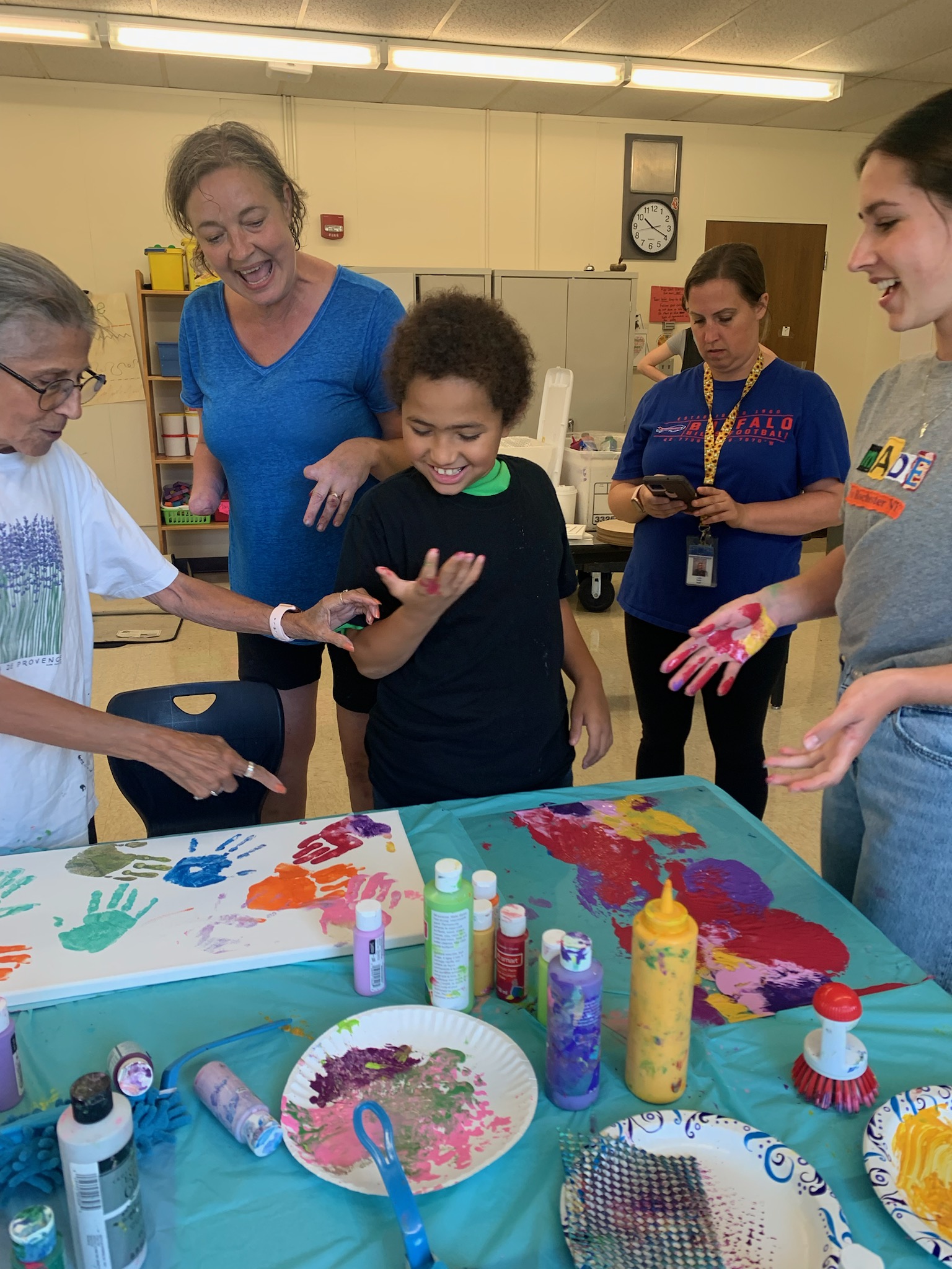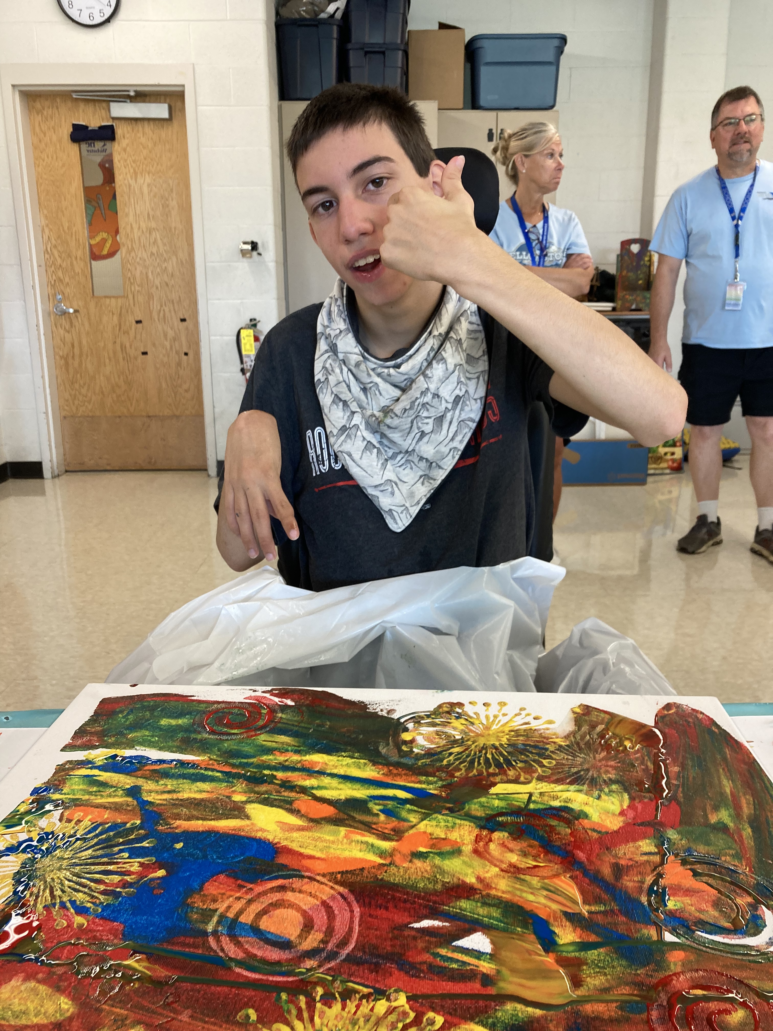 And so this very special art exhibit began. For this year’s show, Kate began working with her artists back in May. She would pull the Challenger Field athletes aside when they came off the field and encourage them to do some painting. Over the summer she created art with the students in the district’s extended school year program. She even held a make-some-art day in her backyard.