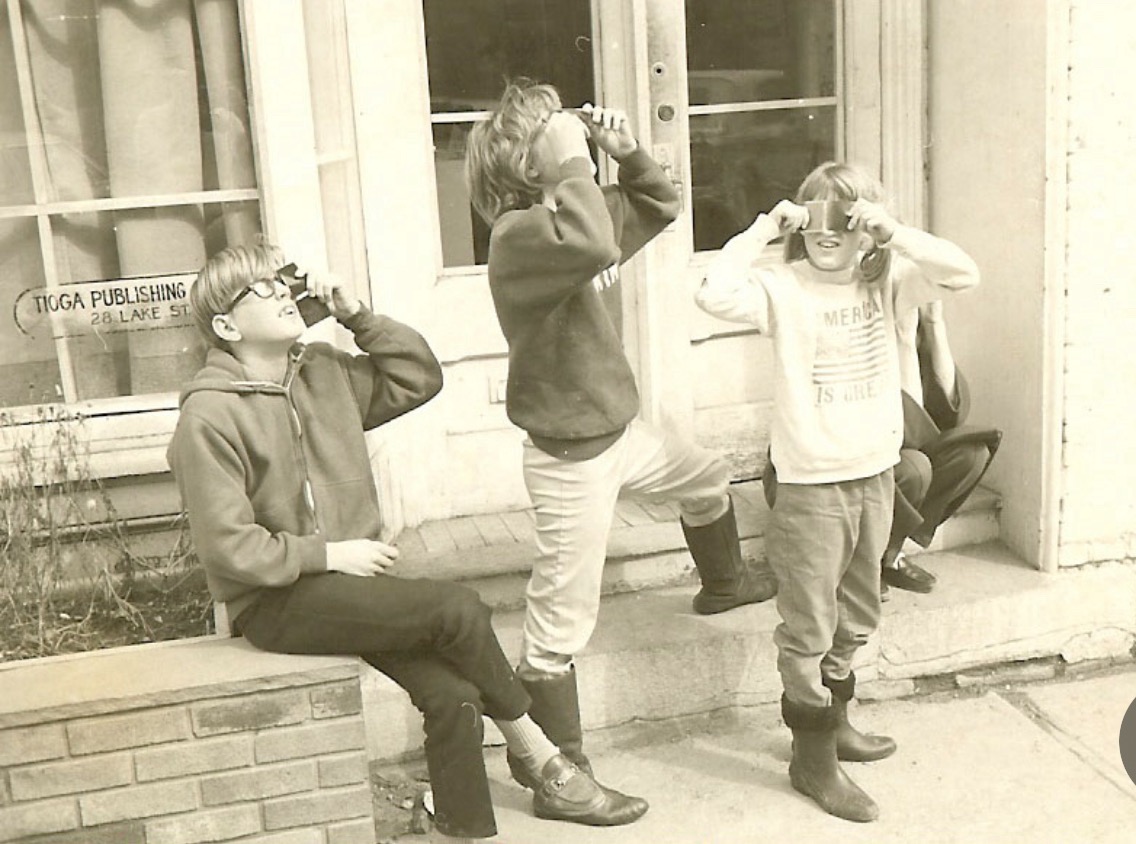 The whole day brought me back to 1969 (I believe), when I was living in Owego, when my mother (who worked at the small-town newspaper) handed us some photo negatives so we could view that year’s partial solar eclipse. In the photo below are my brother Chris (left), my sister Mindy (right) and me in the middle, outside the newspaper office.