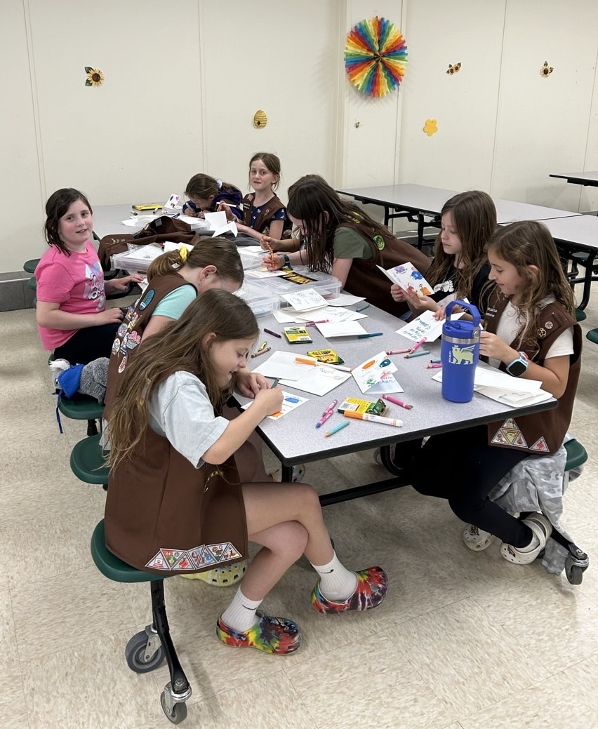 By the way, the same evening when we took the photo of the donated cookies, the Brownies were holding their regular meeting, where they worked with Mary Ann O’Mara to make 45 greeting cards for the troops, which will also be included in the care packages.
