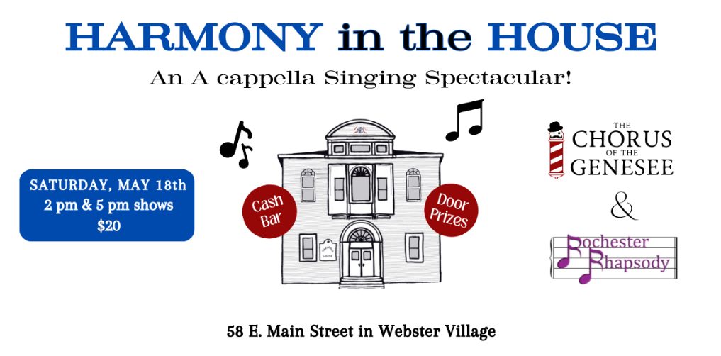 It’s a harmony-filled musical treat which all happens at the beautiful, historic Harmony House, 58 East Main St. in the Village of Webster, home to the Chorus of the Genesee for 50 years. Shows will be held at 2 p.m. and 5 p.m., and tickets are just $20. Click here for tickets, and feel free to add an extra donation (please and thank you) to benefit the Harmony House Renovation Project.
