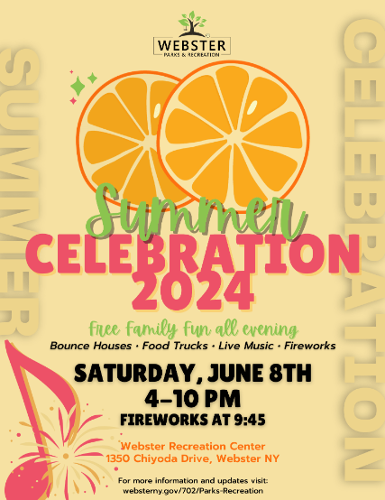 Saturday June 8:Summer Celebration from 4 to 10 p.m. at the Rec Center. This is always a terrific event with a bounce house, food trucks, live music and fireworks at the end of the night. Free to all, and no registration is required.