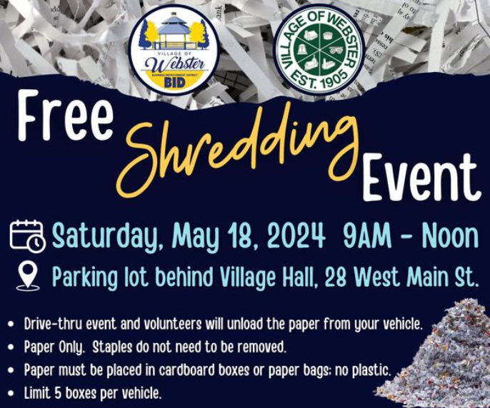 The Village of Webster is hosting a free shredding event on Saturday May 18 from 9 a.m. to noon in the parking lot behind Village Hall and the Webster Fire Department.