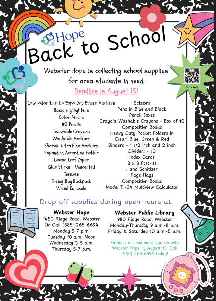 Webster Hope’s Back to School Night will be held on August 20. Families in need can sign up by Aug. 15 to participate. Call (585) 265-6694.