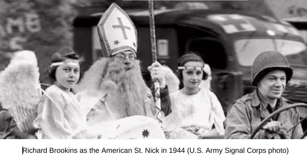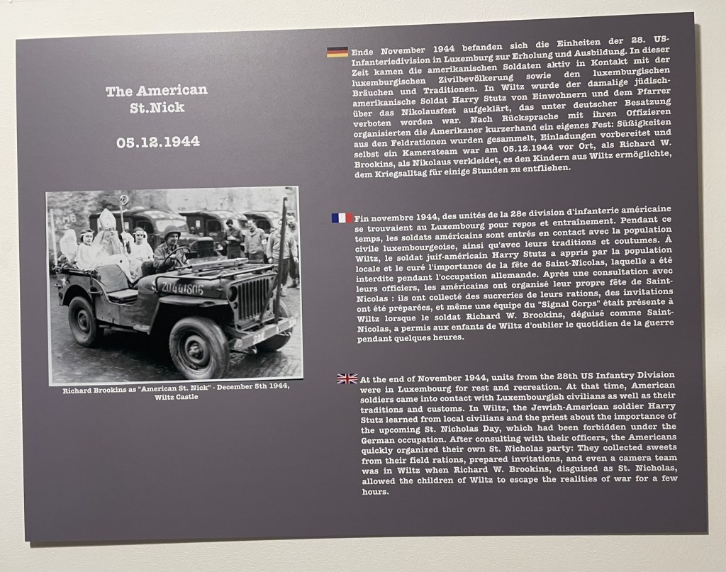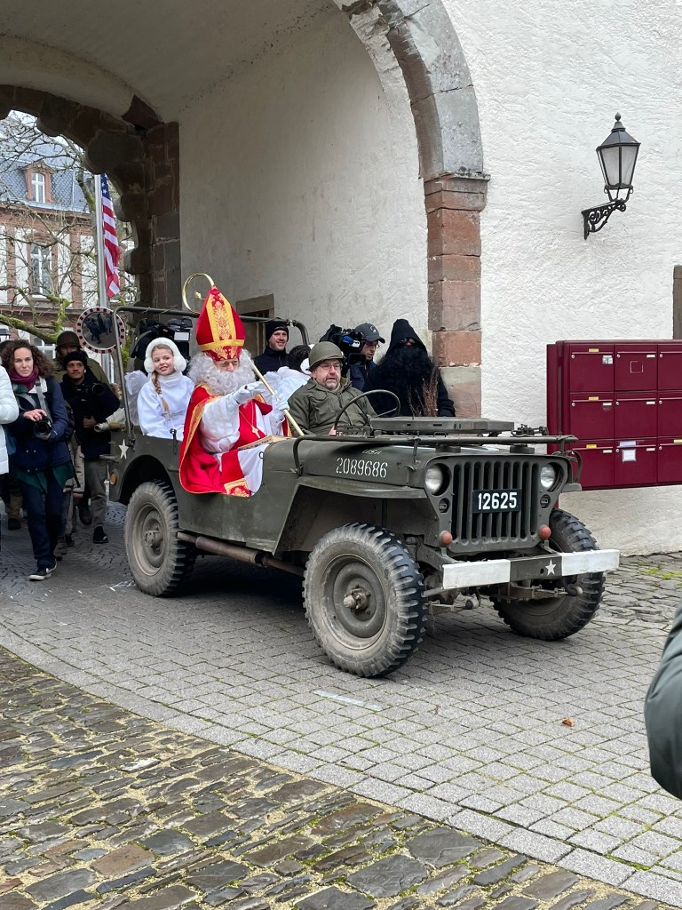 But the story does not end there. The people of Wiltz never forgot the day the American St. Nick came to town. After the village had recovered from the war, the townspeople started to annually recreate the American soldiers’ party for the children. Each year St. Nicholas, wearing glasses similar to Richard’s, would ride a jeep into town accompanied by two angels and greet the children with chocolates and treats.