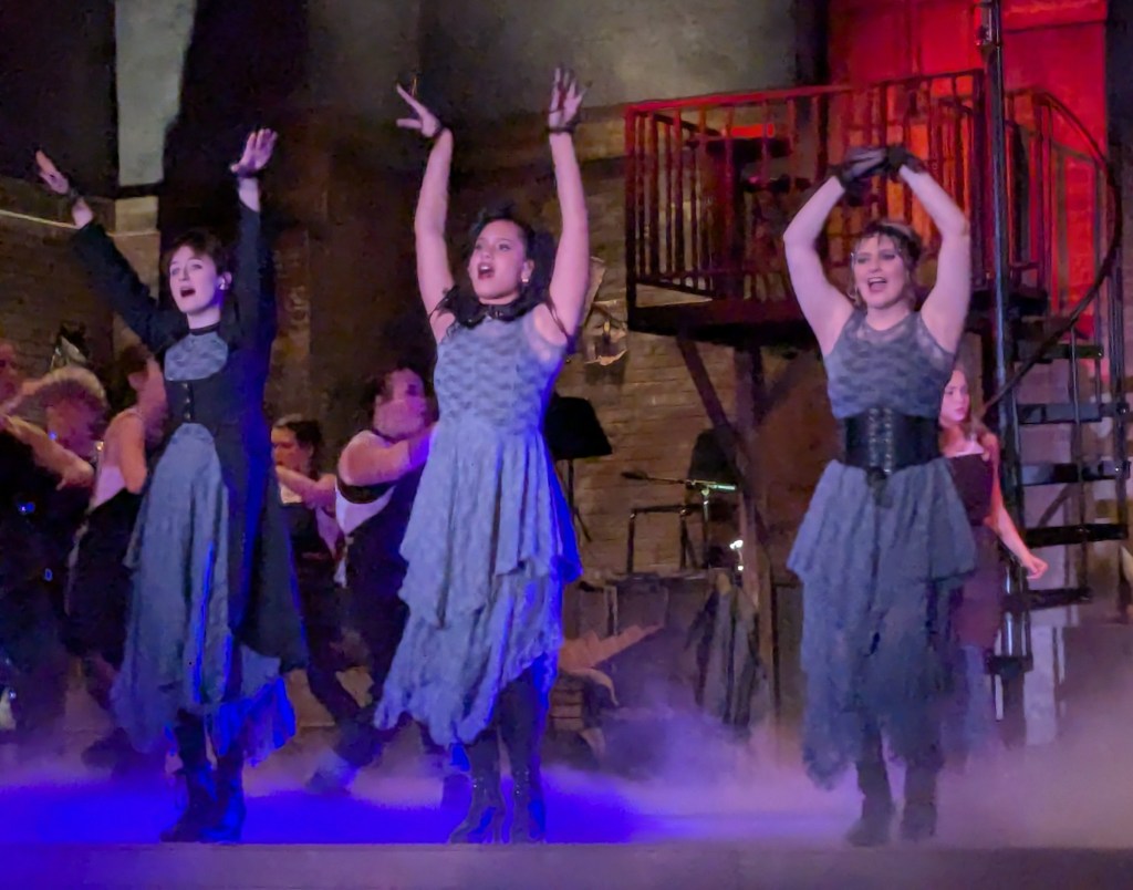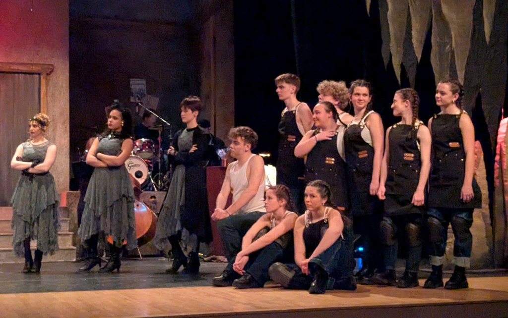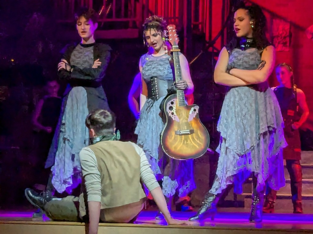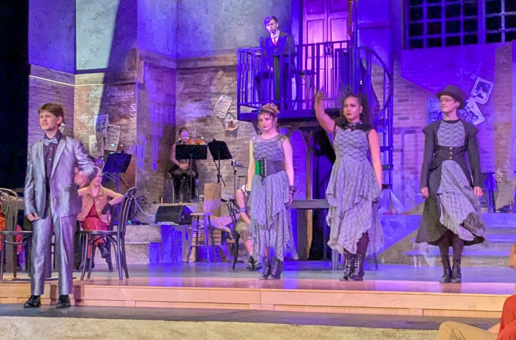 Those examples are just the tip of the iceberg when it comes to the hard work these young actors have been putting in to bring Hadestown to the stage. (And they are young. For many of them, this is their first Schroeder production.) From the powerful opening song, to the lilting love ballads, to the jarring underworld chants, the music is challenging, but the harmonies are breathtaking. The choreography and staging are complicated but delivered without a hitch.