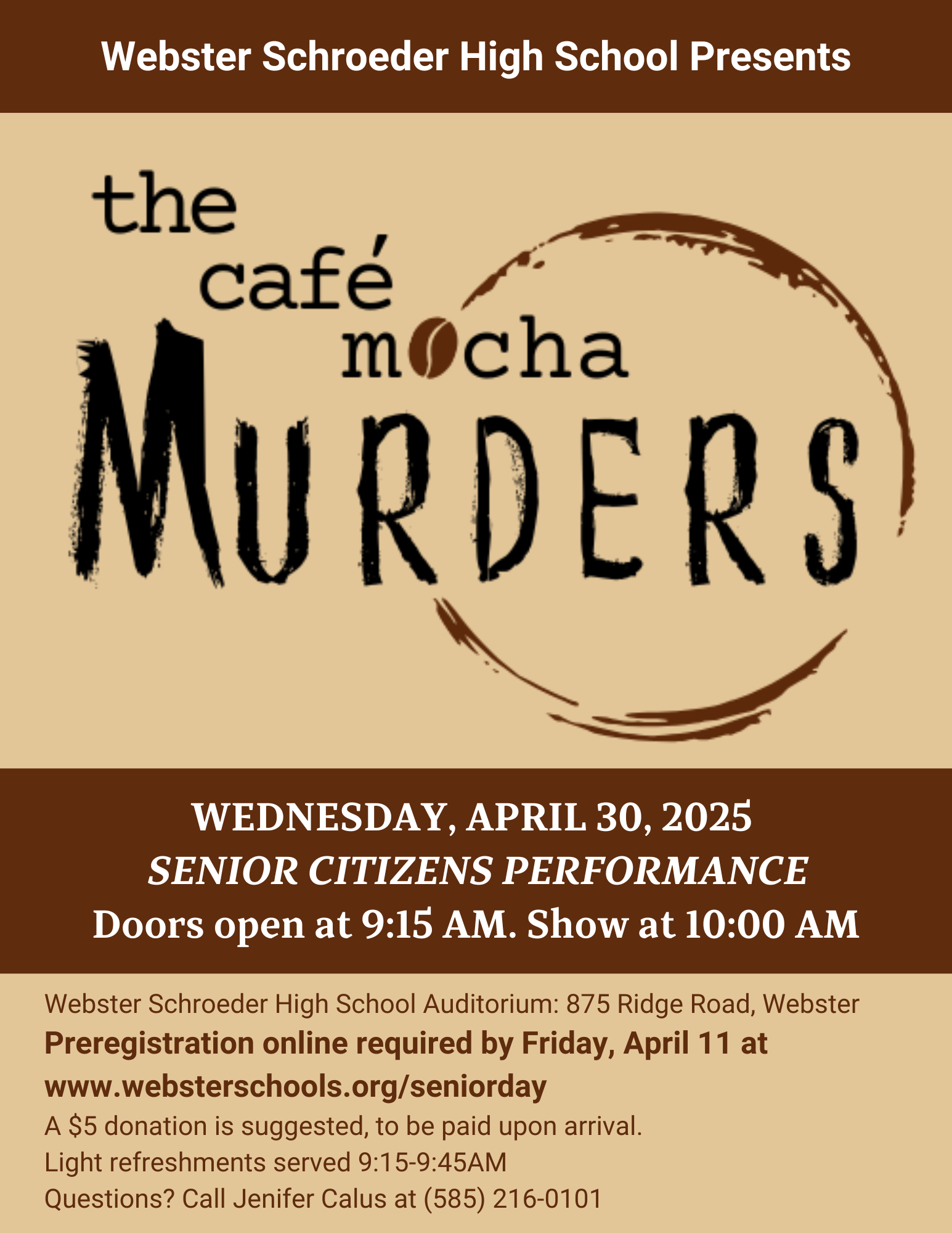 Webster Schroeder High School’s next stage production, The Café Mocha Murders, will take place the first week of May. But before the rest of the community gets to see it, our community’s senior citizens are invited to a special sneak-peek at the play on Wednesday, April 30.