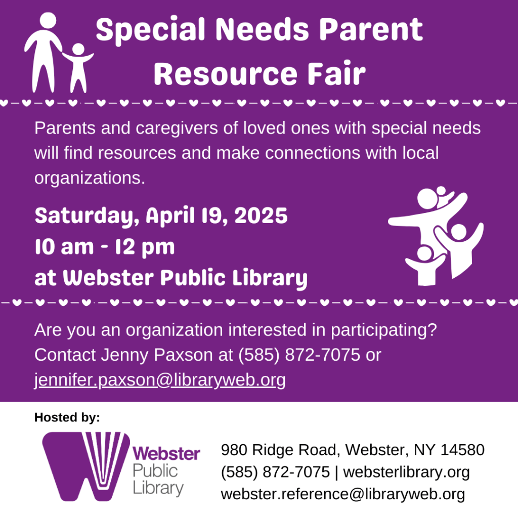 The Webster Public Library will host its annual Special Needs Parent Resource Fair on Saturday April 19 from 10 a.m. to noon. This event is especially for parents and caregivers who are looking for community resources to support their loved ones who have special needs.