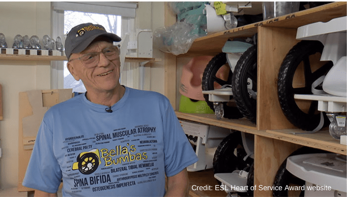 When Martin’s great niece was born with spina bifida, he and his wife, Rebecca were inspired to find a way to help her become more independently mobile and set out to design a wheelchair just her size. From there, Martin began designing additional designs for wheelchairs that help children with over 70 mobility challenging disabilities and enlisting a team of volunteers to construct them, sending them to kids across the globe, free of charge (recipients only pay for shipping).